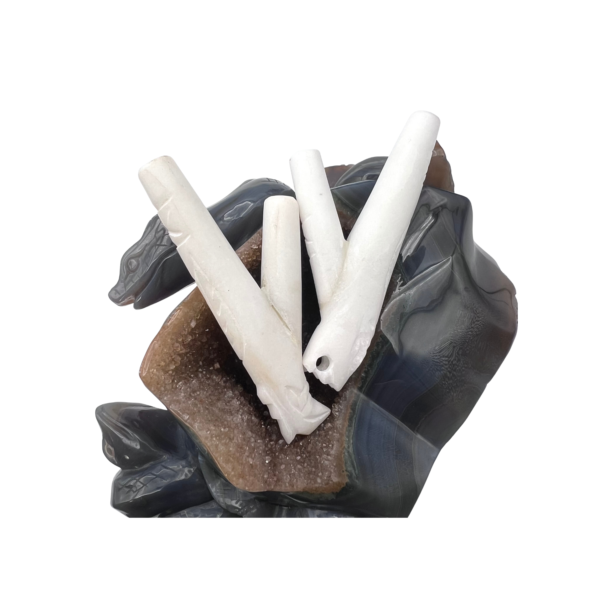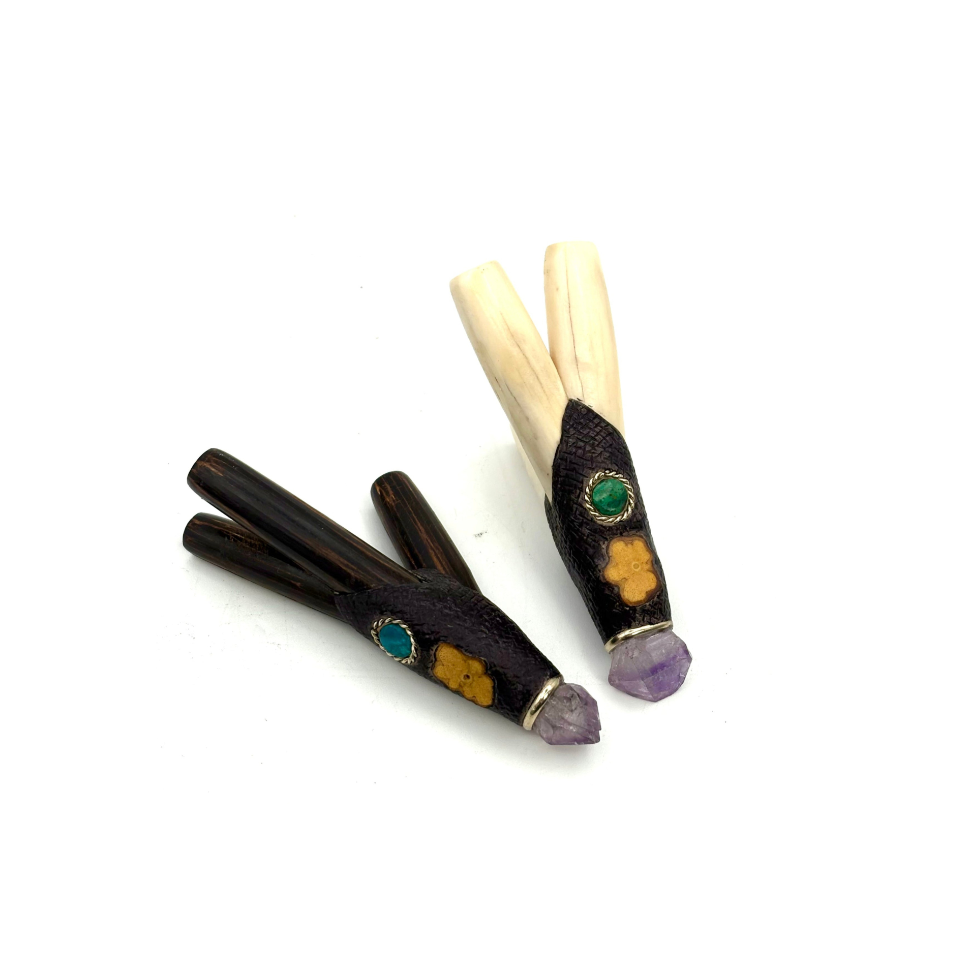 A Kuripe is an essential tool for the safe and intentional self-application of Hapé, guiding the breath and medicine with clarity, precision, and respect. Each piece in this collection is handmade by our collective and are crafted from natural materials such as bamboo, bone, seeds, and sustainably gathered forest woods.